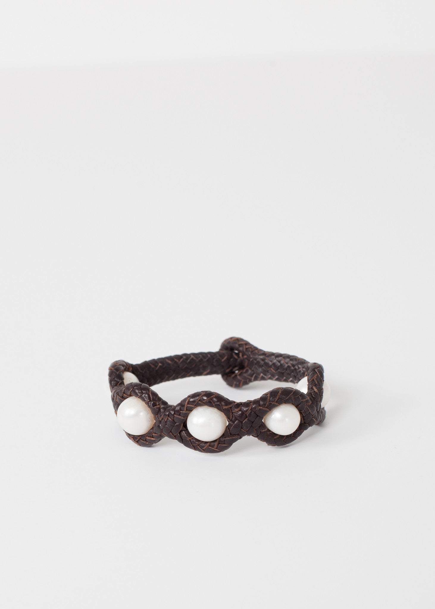 Kalosoma Jewelry demonstrates the rigorous beauty in the handmade. Five freshwater pearls nested delectable braided band. Scarab detail. Knotted closure. Color Brown. 100% Leather. Made in Mexico. Length 7 1/2 inches.