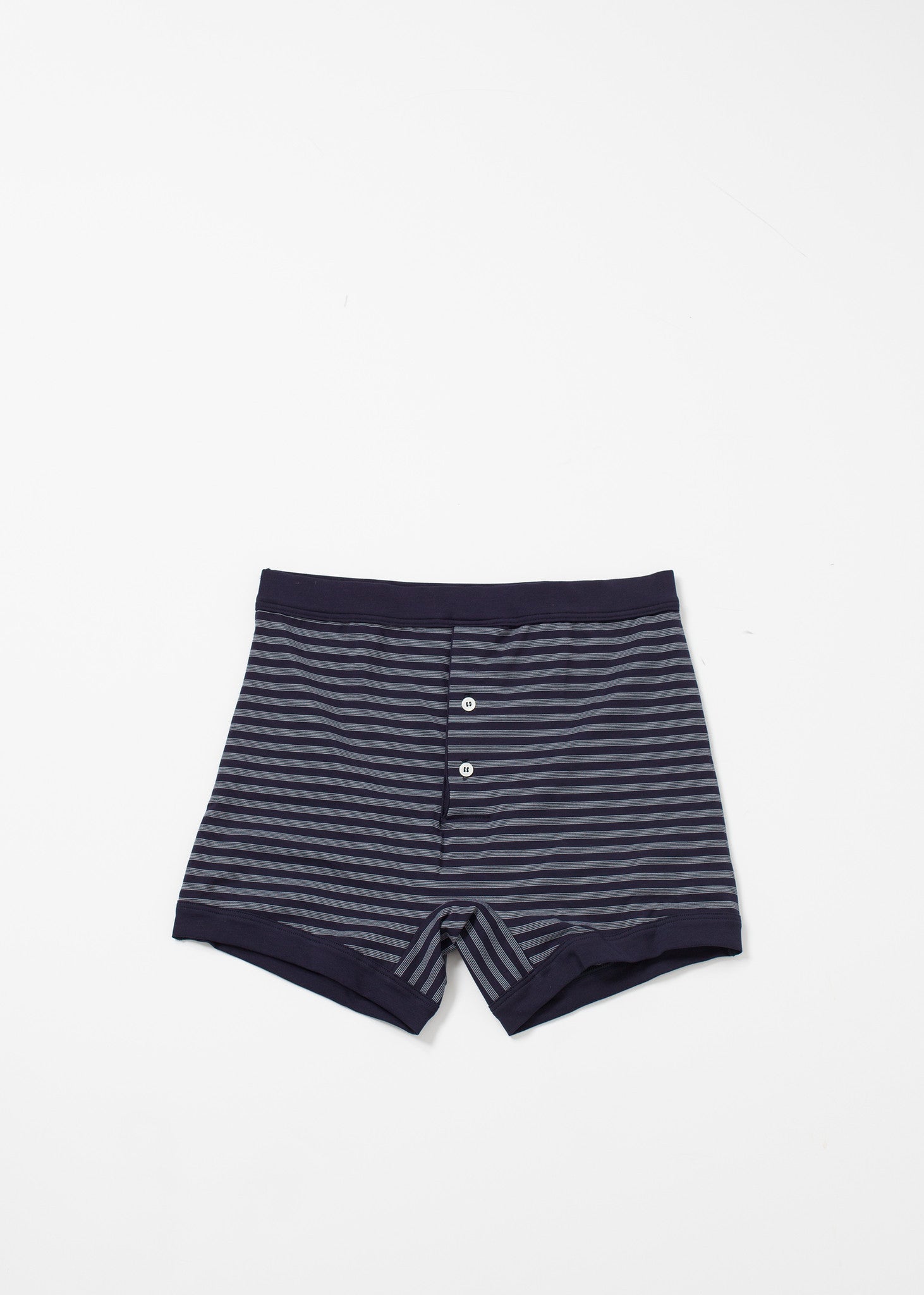 This prewashed cotton trunk is composed of the finest gauge for the softest materials. Offers stretch and softness in wear. Elastic waistband for ease. Etiquette. Color Navy/Grey. 95% Cotton, 5% Elastane. Made in Italy.
