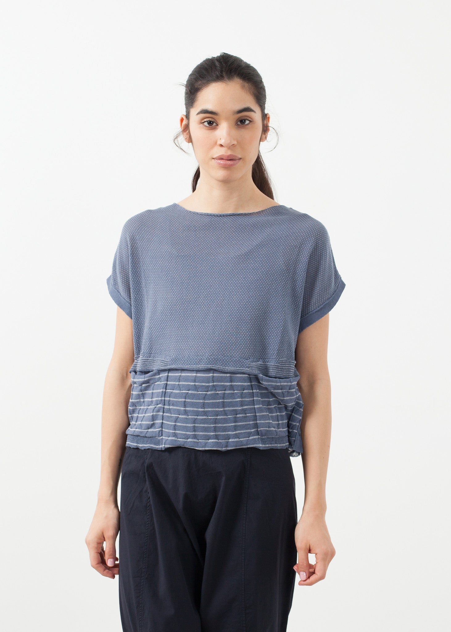 The Rab is a fun piece with contrasting patterns and textures. Engaging and light, this top is a whimsical addition. Double half button placket at side. Lilith. Color Blue. 91% Cotton, 9% Nylon. Made in Hungary. Ashley is wearing an XS/S.