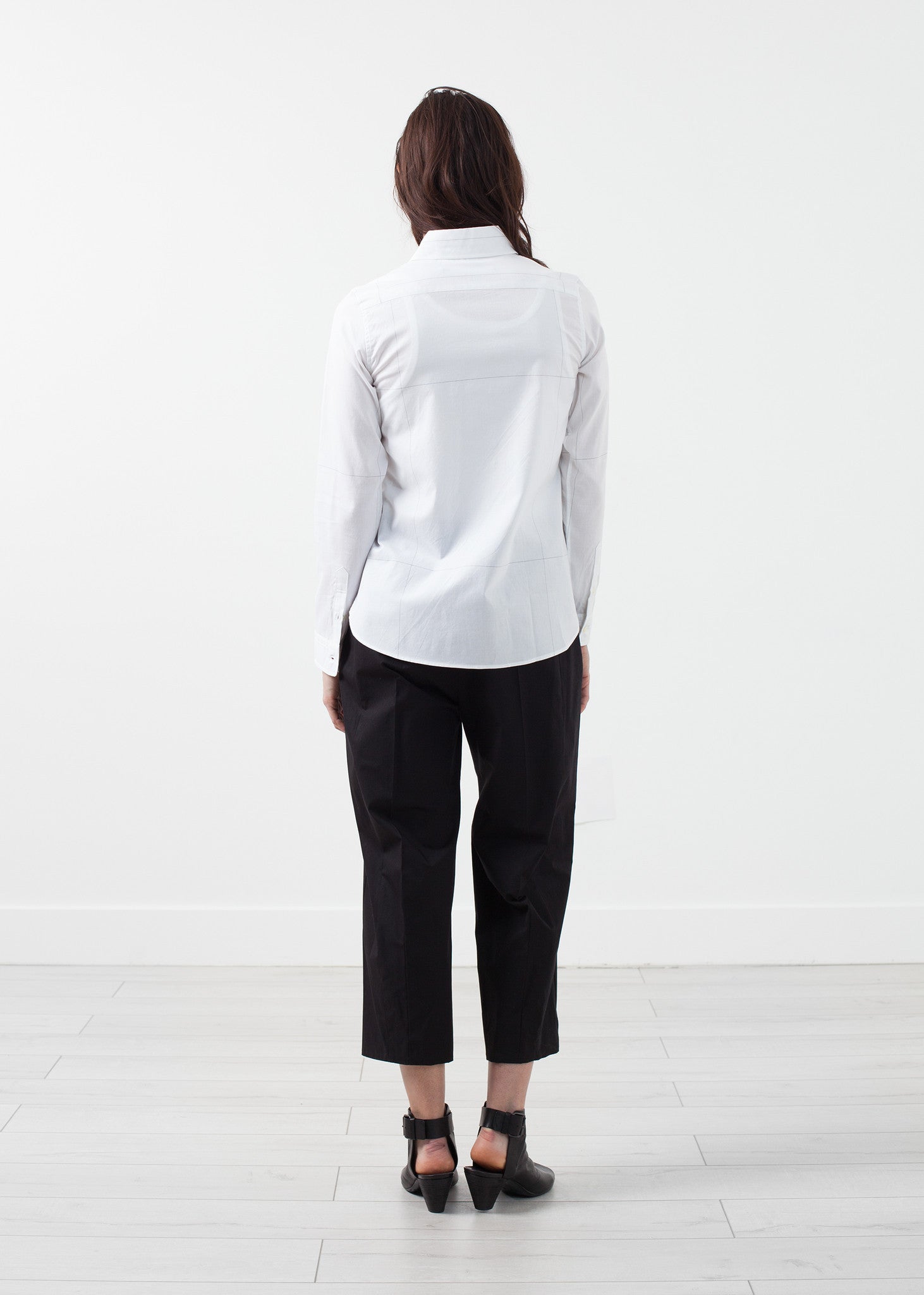 The Standard Shirt borrows its' silhouette from menswear for a unique tomboy feel. Button placket closure at front. Nicholson & Nicholson. Color White Check. 99% Cotton, 1% Polyurethane. Made in Japan. Lana is wearing a French 38.