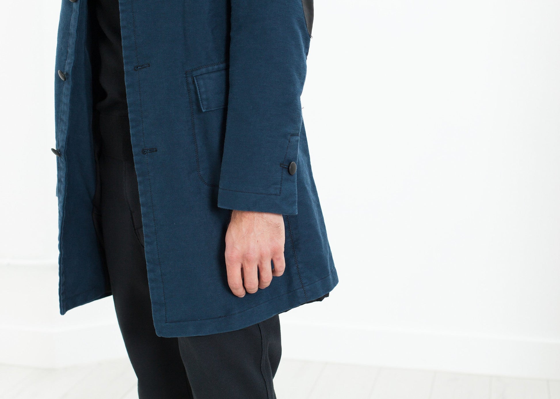 A stiff cotton overcoat is made naturally water resistant as the tightly woven fibers swell in inclement weather. Lamb leather details at button loops, inner collar and pocket welts. Two in-seam hand warmer pockets and one button at the end of the sleeves. Hannes Roether. Color Evening. 100% Cotton and 100% Lamb Leather.
